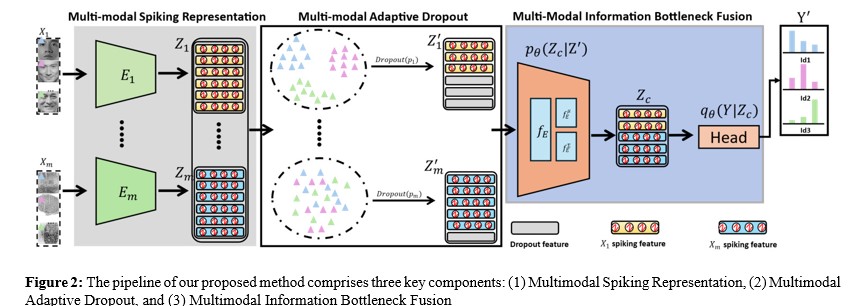 As illustrated in Figure 2, our pipeline consists of three main components: (1) Multi-modal Spiking Representation, (2) Multi-modal Adaptive Dropout (MAD), and (3) Multi-modal Information Bottleneck Fusion (MIBF). First, Multi-modal Spiking Representation employs m independent spiking encoders to extract feature representations from different modalities. These spiking encoders capture the unique characteristics of each modality and transform them into discrete spike information, providing rich sparse spiking feature representations for subsequent processing while reducing computational overhead during modal fusion. Second, MAD applies adaptive dropout operations to the spiking features of individual modalities to mitigate the convergence process of the primary modality and balance the learning effects across other modalities. Finally, guided by information bottleneck theory, MIBF aims to effectively integrate spiking features from multiple modalities, focusing on preserving features most relevant to the final recognition task.