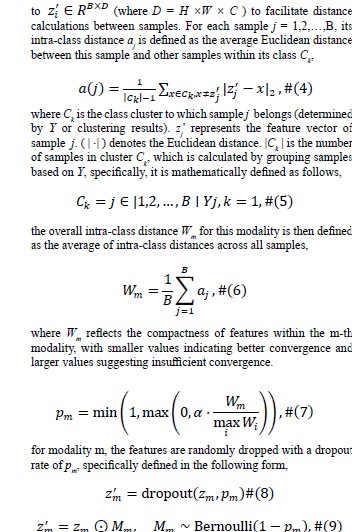 In-depth investigations reveal that during the later stages of deep network training, extracted high-level features become sufficiently rich for widespread pattern recognition tasks, such as cluster analysis. By removing the final fully connected layer (classification head) of neural networks, researchers discovered the ability to distinguish natural groups within datasets without explicit labels, as illustrated in Figure 4. Based on these findings, we can assess the convergence quality of each modality using the Convergence Quality Index [42,43]. We hypothesize that a shorter intra-class distance indicates more thorough feature training for a particular modality, while a longer intra-class distance suggests insufficient learning. We define the intra-class distance using the silhouette coefficient. Specifically, the input feature ðÂÃÃÂ??ÂÃÂ?ÂÂ?§ðÂÃÃÂ??ÂÃÂ?ÂÂ?? ∈ ðÂÃÃÂ??ÂÃÂ?ÂÂ??ðÂÃÃÂ??ÂÃÂ?ÂÂÂÃÃÂ??ÂÃÂ?µ×ðÂÃÃÂ??ÂÃÂ?ÂÂÂÃÃÂ??ÂÃÂ?»×ðÂÃÃÂ??ÂÃÂ?ÂÂ?¶×ðÂÃÃÂ??ÂÃÂ?ÂÂÂÃÃÂ??ÂÃÂ?¶ represents the high-dimensional feature of the i-th modality i ∈ m, and the label ðÂÃÃÂ??ÂÃÂ?ÂÂ?? ∈ ðÂÃÃÂ??ÂÃÂ?ÂÂ??ðÂÃÃÂ??ÂÃÂ?ÂÂÂÃÃÂ??ÂÃÂ?µ×ðÂÃÃÂ??ÂÃÂ?ÂÂ?ÂÃÃÂ??ÂÃÂ? denotes the category information for each sample.