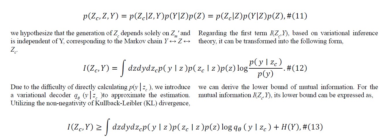 the first term I(Zc;Y) represents the mutual information between the fused representation Zc and the final prediction Y. Our objective is to maximize this value, which implies maximizing the information content of Zc with respect to Y, thereby enabling Zc to predict Y as accurately as possible. Through this approach, we aim to retain information most relevant to the prediction task while reducing redundancy across modalities.