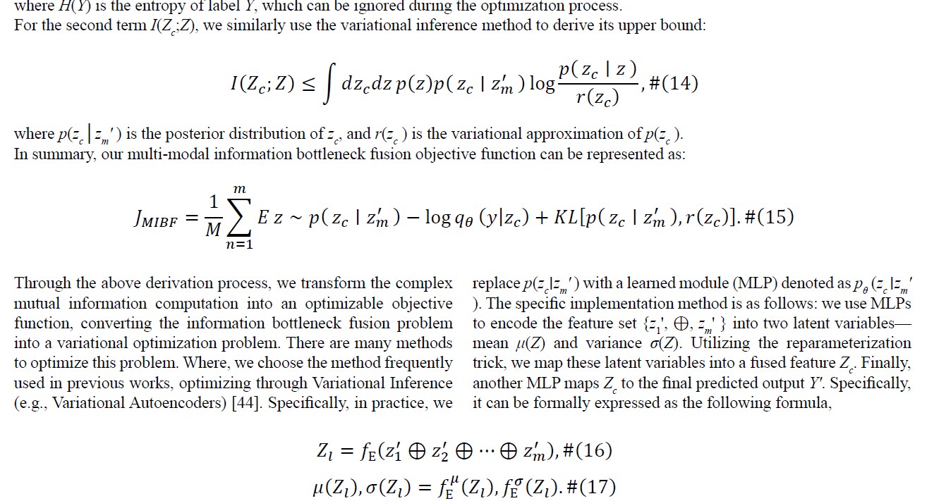 where βcontrols the trade-off. The IB framework maximizes information retention during compression and has been widely applied in multimodal learning and deep learning.