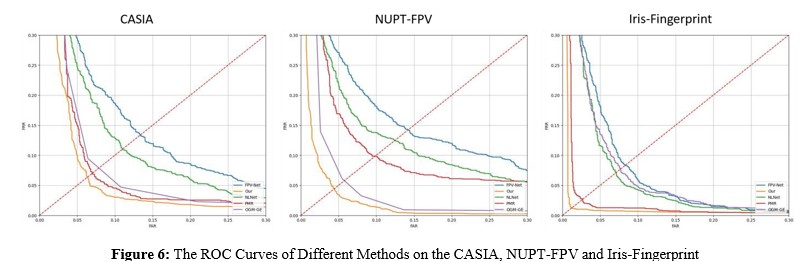 We conducted experimental evaluations on three datasets: CASIA, NUPT-FPV, and Iris-Fingerprint. For CASIA, samples 1-20 were used for training, 21-25 for optimization, and 26-40 for testing; for the other two datasets, samples 1-3 from each category were used for training, 4-5 for optimization, and 6-10 for testing. The experimental results, as show in Figure 6, demonstrated through ROC curves, showed significant performance advantages: on CASIA and NUPT-FPV datasets, our method exhibited superior recognition accuracy across multiple FAR intervals; on the Iris-Fingerprint dataset, despite narrower performance gaps, it maintained optimal EER in the low to medium FAR range