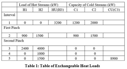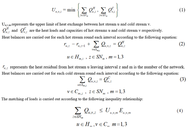 The software LINGO is used to run the linear programming optimization program. Table 1belowshows the exchangeable heat loads data used for program execution. Stream matchings are implemented within individual subnetworks only. In each stream matching the upper bound of the heat stream load and the cold stream capacity is taken as the exchangeable load.