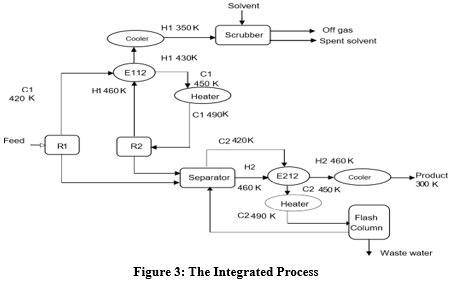 In addition to the objective function equation, the LINGO program involves heat balances for H1, heat balances for H2, heat balance for steam utility HU (H3), heat balances for C1, heat balances for C2, heat balance for cooling water utility CU (C3), matching of loads equations, non-negativity constraints, and declaration of binary integers El-Halwagi [4].The solution of the LINGO program indicates that the optimal configuration network requires the introduction of two heat exchangers out of the possible four cases in the objective function. In addition, two smaller heaters and two smaller coolers are needed to provide the utility loads needed to meet the balance of the minimum requirements specified in the revised cascade diagram. Figure 3 below shows the expedient placement of the two heat exchangers E112 and E222 and the smaller two heaters and two coolers in the integrated system. The annual utility costs, and capital expenditures are presented in tables 2, 3 ,4, and 5 below.