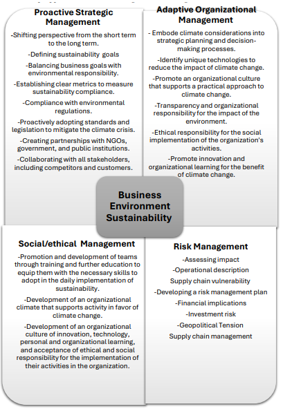 In evaluating the intersection of the climate crisis and business, organizations face both distinct physical challenges and a spec- trum of opportunities. This aligns with Li's 2023 claim and that of colleagues, suggesting that adverse climate change can yield pos- itive impacts and benefits that the firm can leverage to its advan- tage. This analysis categorizes the relevant business responses into two primaries subcategories: business adjustment initiatives and technological innovations, with a particular focus on sectors se- verely impacted by climate-related hazards. These sectors encom- pass pharmaceuticals, refrigeration, energy infrastructure, finance, insurance, agriculture, beverages, tourism, communications, and biofuels. Adjustment practice is pivotal for mitigating risks asso- ciated with physical hazards. These strategies extend beyond ad- dressing direct emissions and encompass a multifaceted approach that includes sustainable product development, enhanced supply chain resilience, market entry into emerging economies, and in- novative financial mechanisms such as weather derivatives for cli- mate risk hedging. Improving operational efficiency is essential to these initiatives, which involve practices such as switching to LED lighting, adopting alternative cooling systems, and upgrad- ing technology and machinery to meet sustainability standards. These changes not only reduce costs but also promote innovative business models, improve operational capabilities, and better align with changing market trends. Long-term strategies focused on en- ergy management are crucial for maintaining a competitive edge in this evolving landscape.