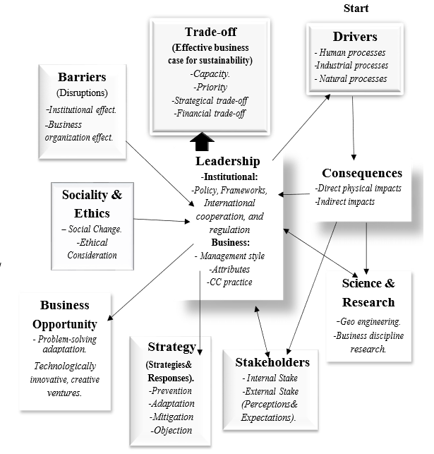 The exploration of Meta-synthesis regarding business roles in addressing climate change is organized around ten key catego- ries, each serving as an essential foundation for building a solid grounded theory. These categories carefully tackle the five main research questions, offering an in-depth analysis of the urgent cli- mate change issue at the center of this study. By systematically organizing the insights gained from the literature, this research not only clarifies the complex relationship between business dynamics and climate change but also creates actionable guidance for future research and initiatives. This approach strengthens a theoretical framework that is both solid and cohesive, effectively connecting academic inquiry with real-world decision-making in the constant- ly changing area of adaptation and mitigation. (Refer to Figure 5 for a visual representation of these ideas.)