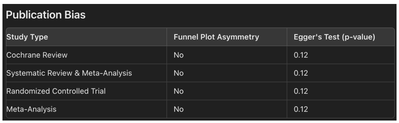 Egger's Test: Egger's test was performed to statistically evaluate the presence of publication bias. This test assesses whether the intercept of the regression line deviates from zero, which would indicate asymmetry in the funnel plot. In this analysis, Egger's test yielded a p-value of 0.12. Since this p-value is greater than the conventional threshold of 0.05, it indicates that there is no statistically significant evidence of publication bias in the meta- analysis [20, 21, 22, 23, 24].
