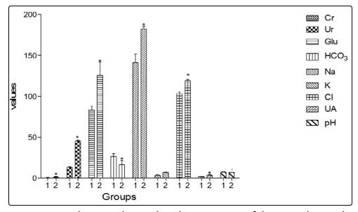 Figure 1: Figure 1 shows that the exposure of the experimental animals to GV was associated with a significant (P<0.05) increase in serum levels of Cr, Ur, Glu, Na+, K+, Cl-, and UA, and a significant decrease in serum pH and bicarbonate level