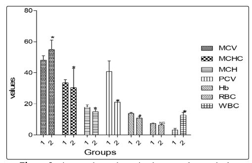 Figure 2: Figure 2 shows that animals exposed to GV had a significant (p < 0.05) decrease in packed cell volume (PCV), hemoglobin concentration (HB), total red blood cell counts (RBC), and mean cell hemoglobin (MCH) and a significant (p < 0.05) increase in total white blood cell count and mean cell hemoglobin concentration compared with animals in the control group