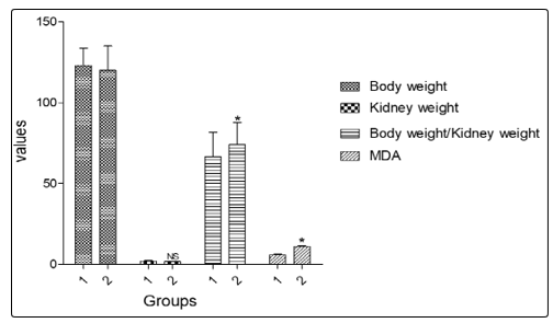 Mean body weight (120 ± 15.02g vs 123 ± 10.75g), kidney weight (1.62 ± 0.37g vs 1.82 ± 0.51g), and ratio of body to kidney weight (74.07 ± 13.58 vs 66.49 ± 15.22) were not significantly different in the exposed compared with unexposed group (p > 0.05). MDA significantly (p < 0.05) increased in the exposed (11.10 ± 0.41mmol/L vs 5.81 ± 0.55mmol/L) compared with unexposed group (Figure 3).