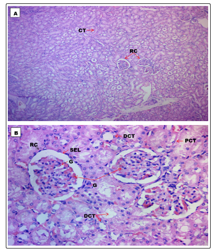 Figure 4 (G1): Shows the histological section of the kidney of animals in the control group at a magnification of A (x100), and B (x400) showing normal kidney morphology. CT=Convulated Tubules, DCT=Distal Convoluted Tubule, G=Glomerulus, PCT=Proximal Convoluted Tubule, RC=Renal Corpuscle.