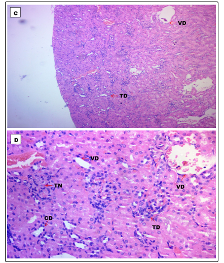 Figure 5 (G2): Shows the histological section of the kidney of animals exposed to GV (80ml/day) for 35 days at magnification C (x100) and D (x400) showing areas of cellular degeneration (CD), Tubular degeneration (TD), Tubular necrosis (TN), and Vascular degeneration (VD)