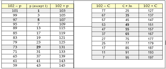 Example S = 248. 248 = (6 x 41) + 2 ; and 124 = (6 x 20) + 4 → 248 is 6x + 2 and 248/2 = 124 is 6x + 4 or 6x – 2. We then calculate n – t and n + t such that n = S/2 = 124 and t = 6x – 1 numbers (Table 9).