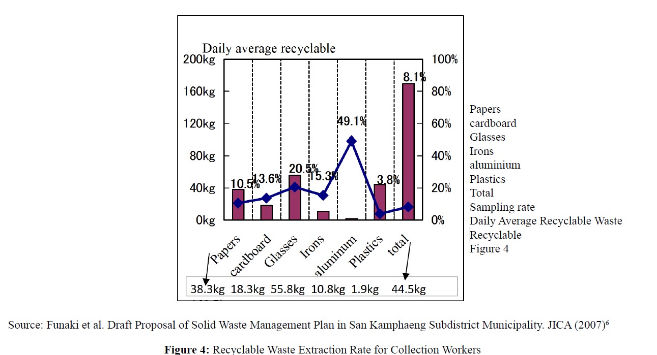 On the other hand, what about Thailand? Both the cities of Chi- ang Mai and Nonthaburi, where I was assigned as Senior Japan. Overseas Cooperation Volunteers, collect garbage every day ex- cept Saturdays and Sundays. However, it is extremely inefficient because there are businesses that put out garbage in iron containers for example, and two people have to carry the garbage to the col- lection truck. Above all, since any kind of garbage can be freely mixed and put out, recyclable papers, bottles, cans, PET bottles, etc. are mixed and put out. For this reason, workers stop the car, tear the garbage bag, take out the resource garbage that can be sold, and put it in the plastic bag attached to the collection car. For this reason, it looks like a full-scale decoration on the roof, on the side of the car (Figure 3). The remaining waste is transported to the landfill, and the recyclable waste is sold to the recycler located in the landfill. This sale is officially recognized by the city as a salary to make up for the small salary. However, it was a trial calculation result that the efficiency of collection would be 30% worse be- cause the work was done by stopping the car. All remaining waste is transported to open dumping landfills. It is not a sanitary landfill covered with soil. According to the results of our investigation of how much the collection workers were able to extract the resourc- es in the waste, the extraction rate of high-selling aluminium (ra- tio of total aluminium: recycling rate) is 49%. Glass such as beer bottles accounted for 21%, iron 15%, corrugated cardboard 14%, paper 11%, and plastics only 4%. Only 8.1% of the total recyclable waste was extracted6 (Figure4). Even in landfills, West Pickers are picking up cheap resource waste left behind by workers, but according to Michael H. Nelson, less than 5% of the waste car- ried to landfills is of very low quality but is recyclable. Howev- er, only about 0.1% of the recyclable materials can be recovered from it [14]. Most of the unsold plastics were piled up in the open, and plastic bags that were dried by the brilliant sunlight were still blown by the wind. There is no way to prevent the outflow of plas- tic bags, etc. into the sea. Due to this condition of the landfill, the landfill has become farther away year by year, and in Chiang Mai it has become a distance of 5 hours by car from the city centre. In Japan as well, in the 1950s, separate collection was not yet carried out, and all waste paper was mixed and thrown into the trash can.