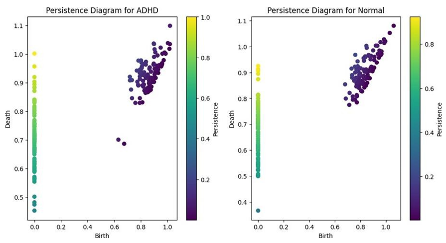 The persistence diagrams provided offer a novel perspective on the topological differences between brain networks in individuals with ADHD and normal controls. These diagrams, derived from topological data analysis techniques such as persistent homology, capture the presence and persistence of topological features (e.g., connected components, loops, and voids) across different scales [20].