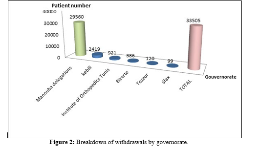 A total of 33505 PCR tests were performed, from five gover- norates including Manouba which represented 88.2% (29560) (Figure 2)