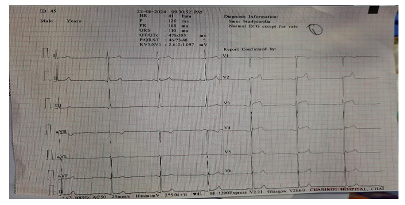 12 lead Electrocardiogram was done which showed sinus bradycardia with heart rate of 41 bpm as shown in figure 1. He was immediately resuscitated with intravenous fluids (two pint of normal saline) and hydrocortisone 200 mg intravenously. On re- examination of patient there was no improvement in his symptoms, blood pressure and pulse rate. Hence, he was treated with 0.6 mg of atropine intravenously, one pint of 0.9 % sodium chloride (normal saline) along with intravenous injection of ondansetron 4mg. Ten minutes later he showed some improvement in his symptoms, blood pressure was 90/60 mmHg and pulse rate were 76bpm. Blood investigations report did not show any abnormality as shown in Table.