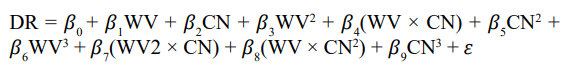 To evaluate whether downstream mortality risk (DR) is structured by the joint configuration of worldview coherence (WV) and cultural narcissism (CN), we fit cubic polynomial regression models of the form:
